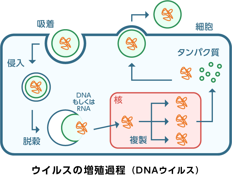 ウイルスを大きく2種に分類すると、B型肝炎や子宮頸がんに代表される疾患の原因となるDNAウイルスとインフルエンザやC型肝炎に代表される疾患の原因となるRNAウイルスに分けられます。